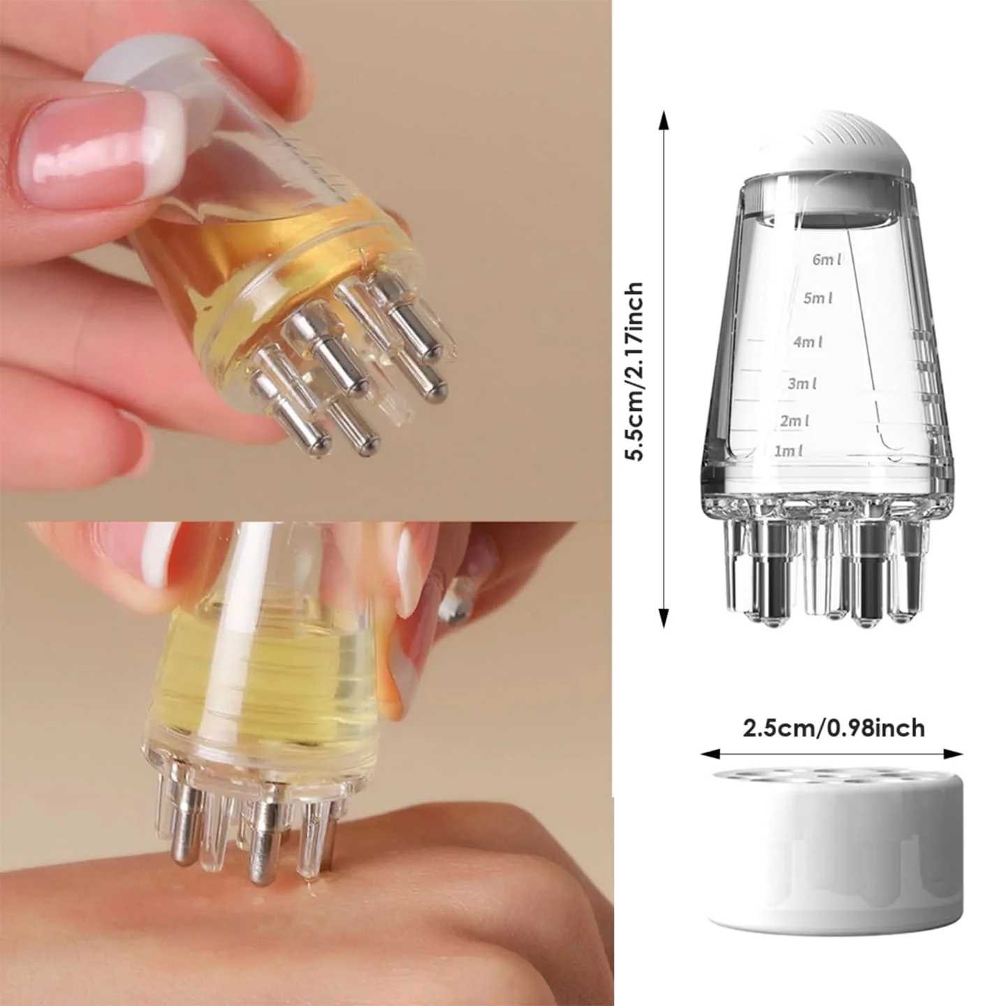 The built-in visible oil tank (6 ml capacity) allows you to monitor exactly how much product you’re using, reducing waste and mess. The comb-style applicator reaches right to the scalp, ensuring oil is applied exactly where it’s needed — not just coating the hair length. At the same time, soft rounded comb teeth and integrated massage/rolling balls help stimulate the scalp, encouraging better circulation, enhanced absorption of hair treatments, and supporting healthier hair-growth conditions.