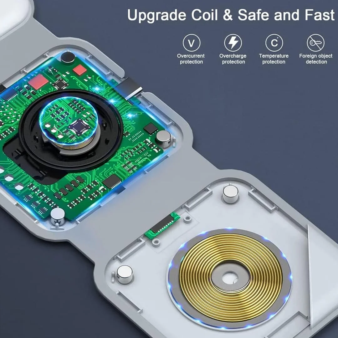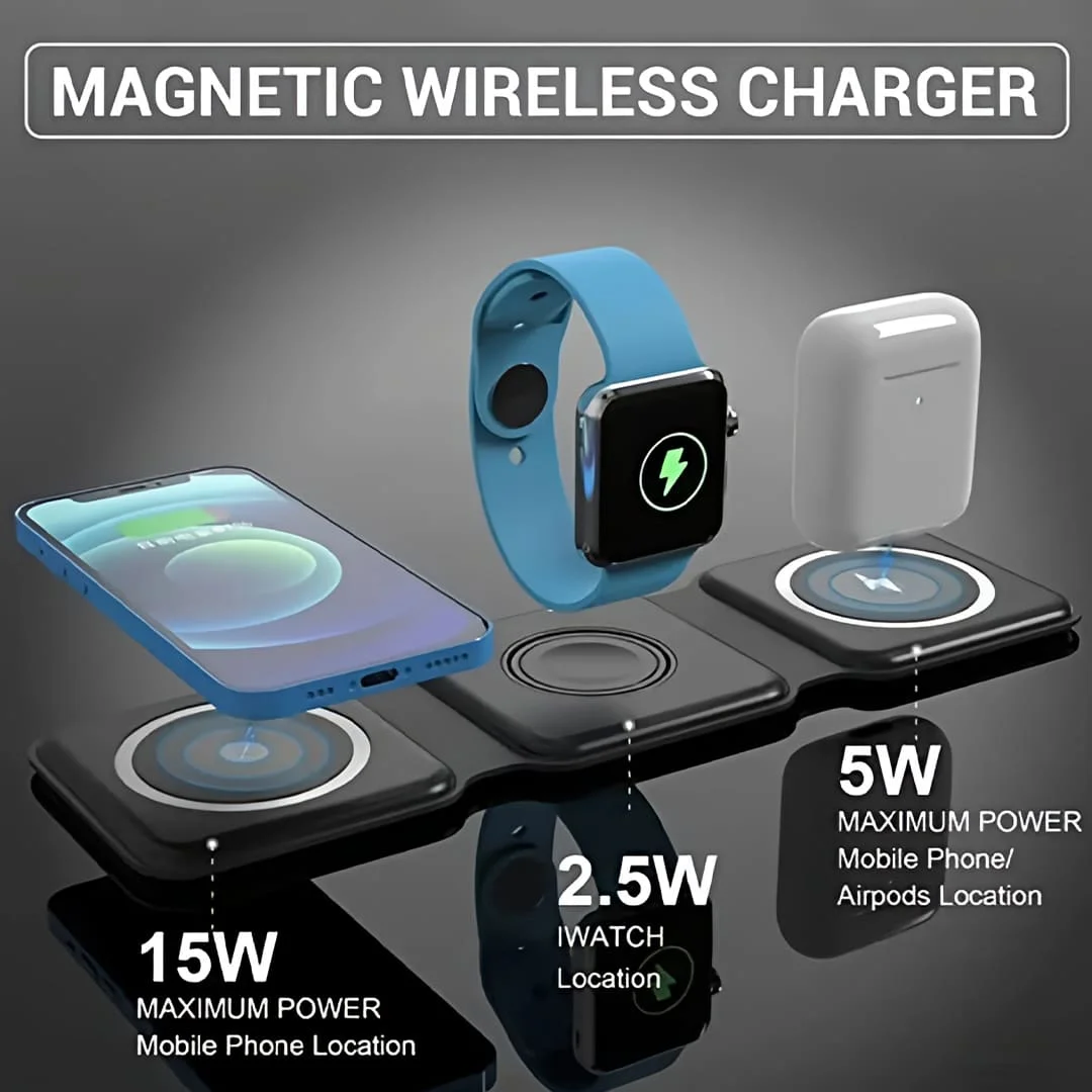 Upgrade your charging experience with the 3-in-1 Foldable Magnetic Wireless Charger. This sleek and compact station lets you charge your iPhone, Apple Watch, and AirPods simultaneously with fast, efficient outputs of 15W, 5W, and 2.5W. Its foldable 180° design doubles as a phone stand, and magnetic suction ensures perfect MagSafe alignment for iPhone 12/13/14 series. Slim, lightweight, and portable, it’s ideal for home, office, or travel. Equipped with a smart chip and LED indicators, it provides safe, visible, and efficient charging every time.