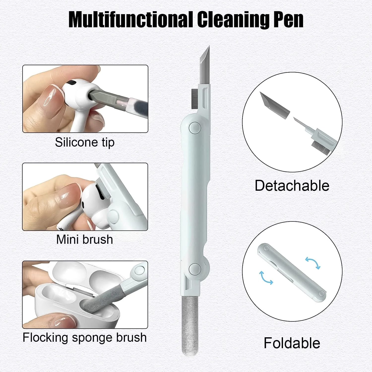 • Foldable Cleaning Pen: Silicone tip for crevices, high-density brush for earbuds and phone mesh holes, and flocked sponge for charging case holes.