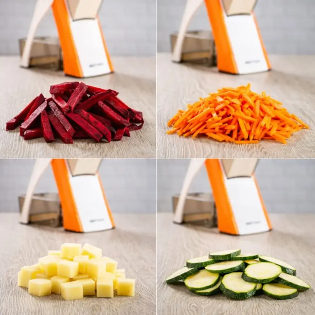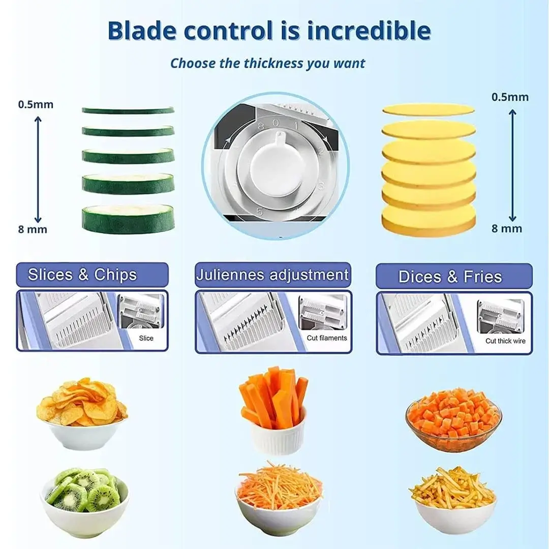 With adjustable thickness settings, you can customize your cuts from thin cucumber slices to thick potato fries or perfectly diced vegetables in seconds. The built-in collection container keeps your kitchen clean and organized, making it ideal for daily cooking, meal prep, and healthy eating.