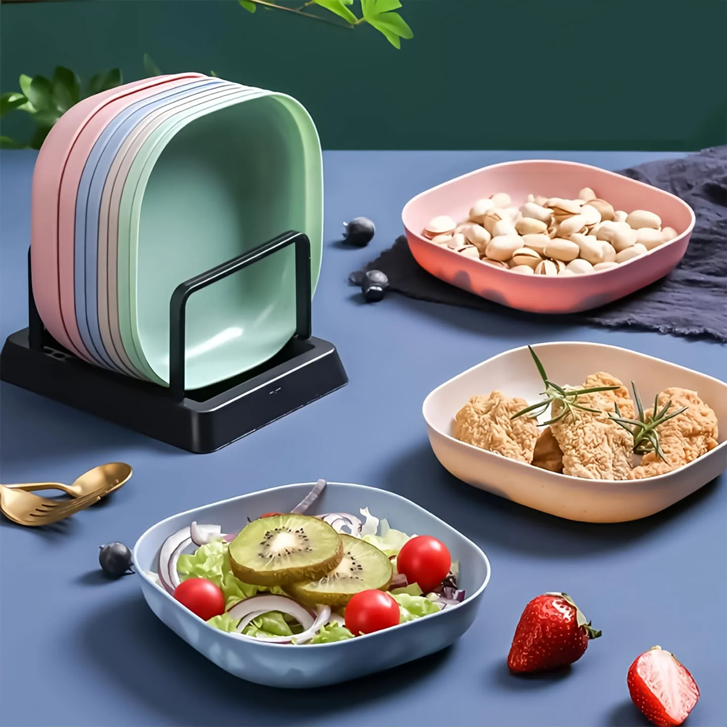 The set also includes a matching storage stand, allowing you to neatly organize your plates on the countertop or in your cabinet. Compact and colorful, this plate set saves space while adding a touch of style to your kitchen.