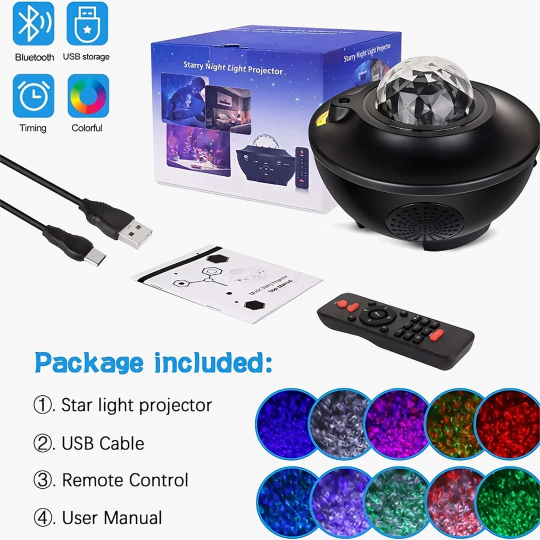 Galaxy Projector Starry Night Light with Bluetooth Speaker – 21 RGB modes, remote control, and adjustable brightness. Perfect for bedroom, decor, or party ambiance.