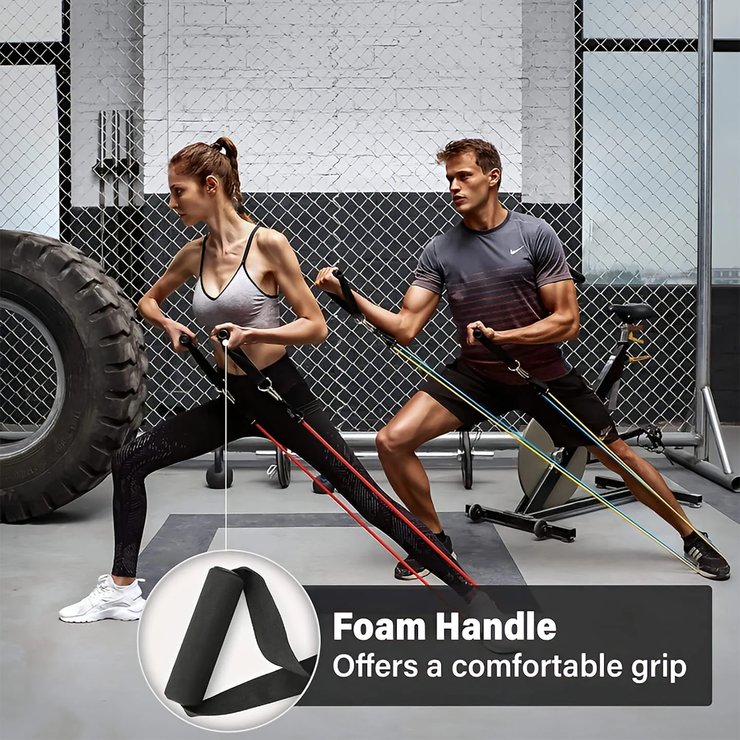The set includes multiple resistance levels, ergonomic handles, ankle straps, and a door anchor for a variety of exercises targeting arms, legs, back, chest, and core. All components come in a compact travel bag for easy storage and portability.