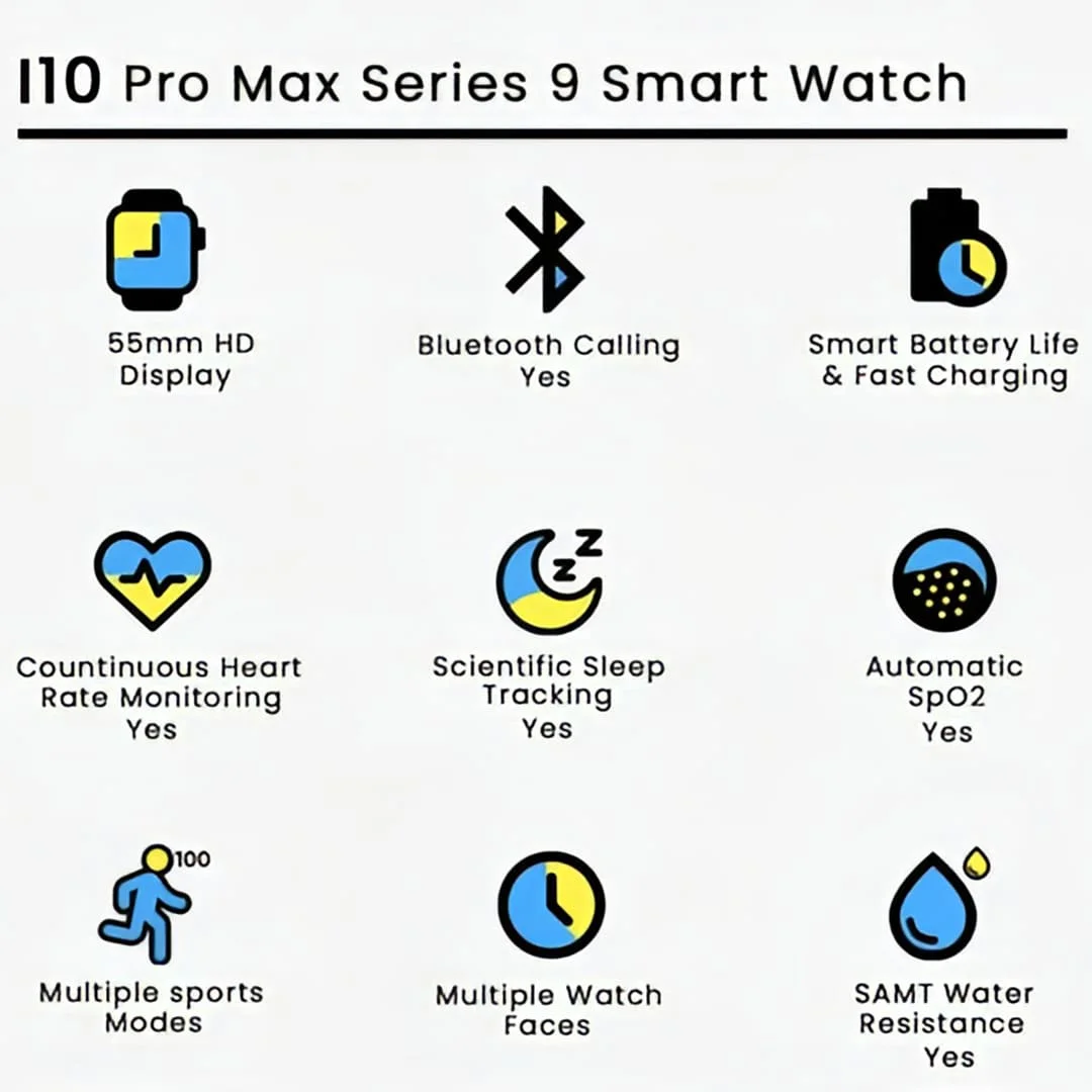Track your health and fitness with advanced sensors that monitor heart rate, SpO₂ (blood oxygen), sleep patterns, steps, calories burned, and distance traveled. Whether you’re working out, walking, or managing daily tasks, the i10 Pro Max helps you stay on top of your goals.