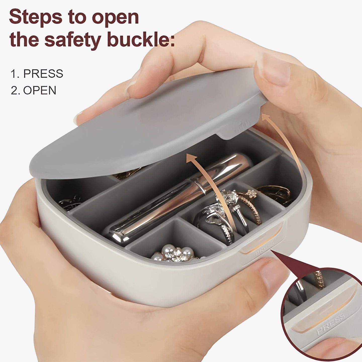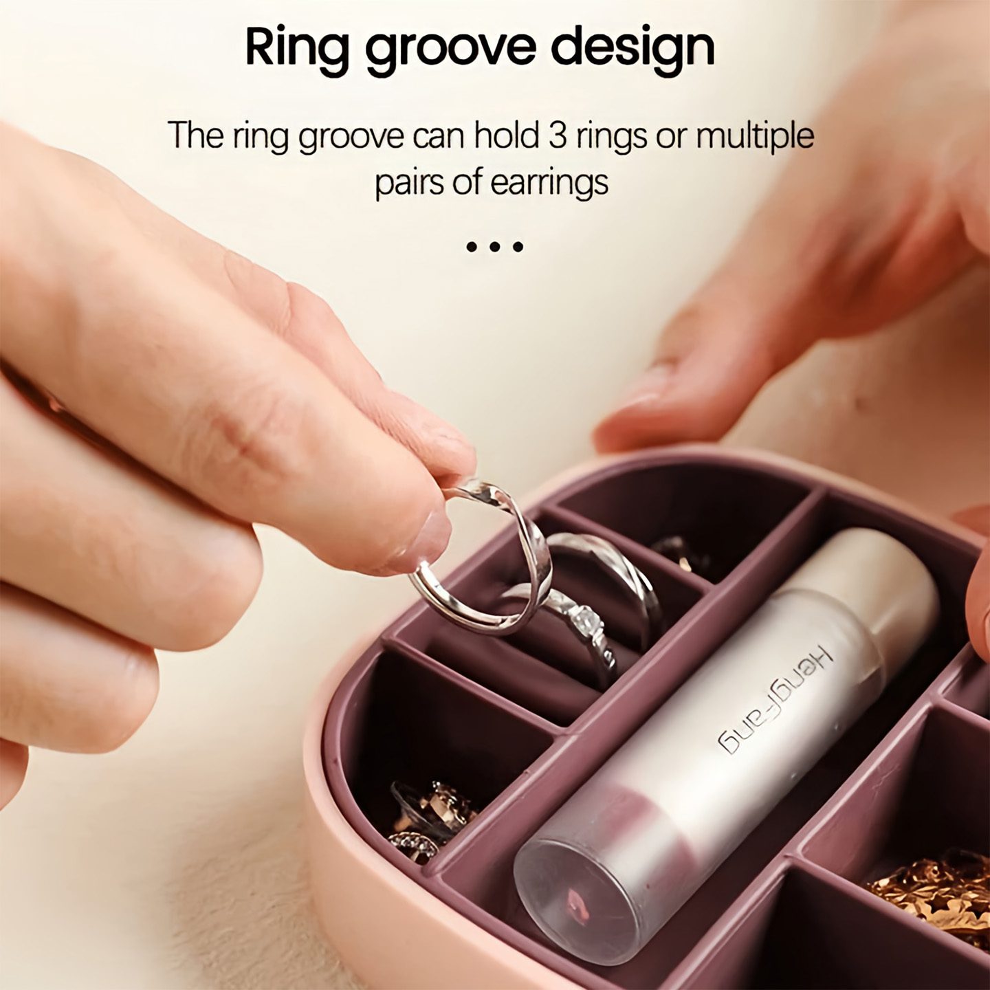 • Ring Groove Storage: Holds up to 3 rings or multiple pairs of earrings.
